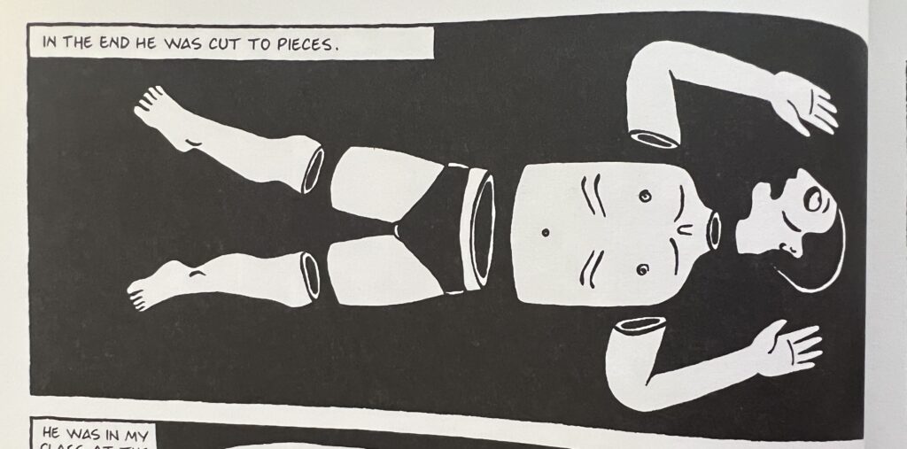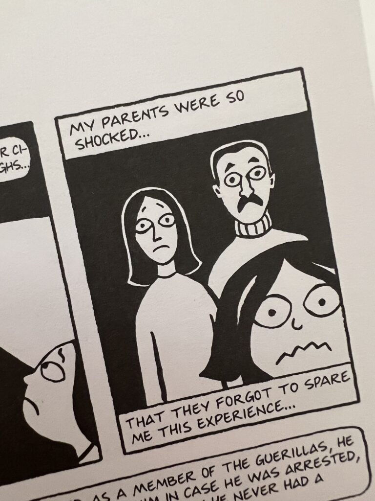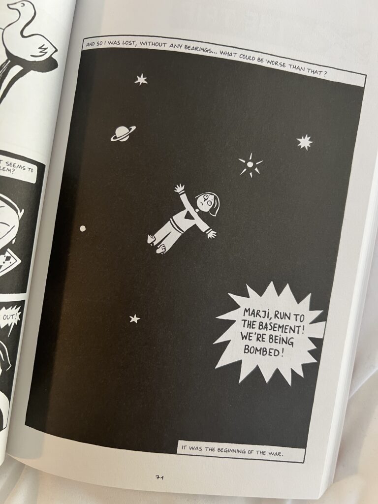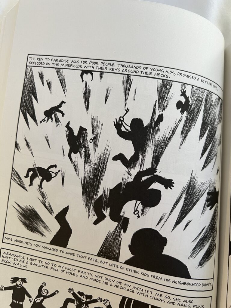 Due to the depressing reality of violence in conflict areas, the humour in this book is essential. It arrives in places, just when it’s needed, and it’s charachter driven: a hilarious quip from Marjane’s father or mother, or Marjane exploding and speaking the truth at the most inopportune time.