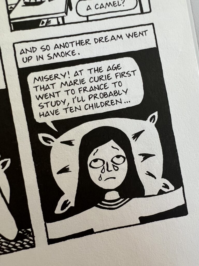 I have so much in common with this author/artist, from the superficial (hobbies, punk ethos, being honest to a fault) to our deepest values (activist upbringing, education, individualism, respect for family). Women’s empowerment is a theme I can’t get enough of. I loved her depiction of getting lost as a young person and then ultimately finding her integrity, strength, and voice. The honesty in this book was refreshing. She didn’t avoid detailing themistakes she made along the way. And where we’re different, I learned so much. I know more about the history of her home, social groups, and struggles in Iran. I have a better understanding of what it feels like to be a refugee and how other students often neglect the lived experiences of refugees. I’m grateful to Marjane Satrapi for creating this gorgeous, enlightening book.